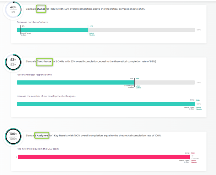 Please note that, each card will contain all objectives that fall into that category.For example if you own 3 OKRs they will be displayed in the Owner Card- this is also important for the calculation shown that we will explain below. 😊