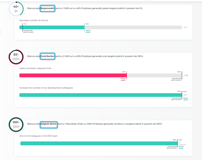 In continuare, vei putea vedea rezultatele pentru fiecare OKR în care participi ca unul dintre rolurile menționate (Responsabil, Contribuitor sau Assignat direct).
