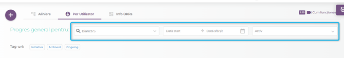 Odata ce pagina se deschide, vei vedea că filtrul implicit este setat pe contul cu care ești logat, fără perioadă sau taguri specifice, afișând OKRurile ce au statusul Activ..