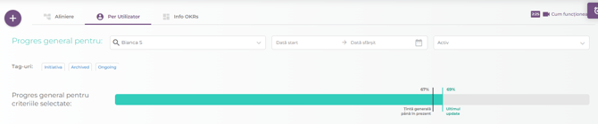 Acesta ne genereaza următorul view, unde poți vedea Progresul general pentru criteriile selectate, pentru toate OKRs pentru care ești fie Responsabil, Contribuitor sau Assignat direct( in cazul Rezultatelor Cheie).