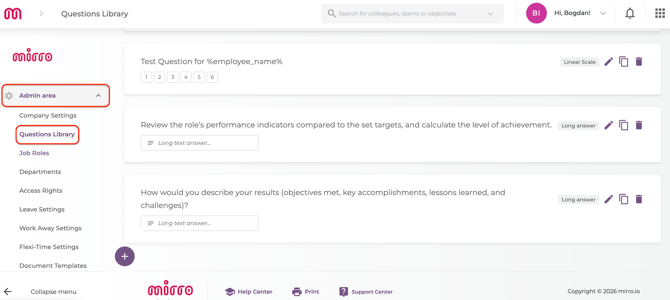 By default, Mirro offers a standard performance check-in form, with preset questions. To view these questions, you can navigate to the module Admin Area- Questions library. In this section, you can view all the existing questions, edit, delete or copy them, or you can create new ones: