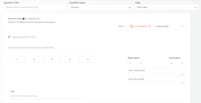 -tags: each question can have different tags that can help you navigate them easier; for example, some useful tags could be managers, 1:1's, review, check-in, onboarding etc; that way, you can assign each question to a specific category, and you can filter them by these tags;