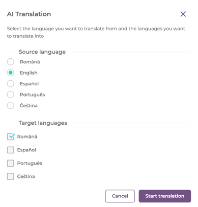 -language: we offer a default list of languages (Romanian, English, Spanish, Czech, Portuguese), and an AI tool, that lets you select the language you want to translate the question from, and the languages you want to translate into: